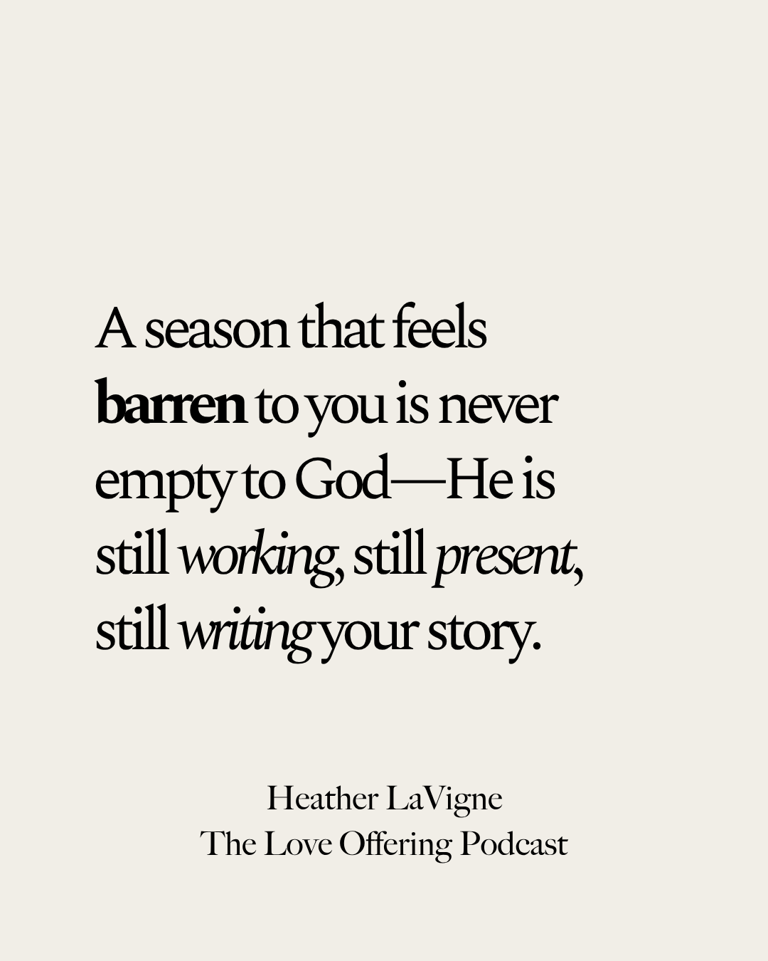 In this week’s episode of The Love Offering Podcast, I talk with Heather LaVigne about her book Barren and the tender reality of trusting God in seasons that don’t unfold the way we hoped. Through her personal story of infertility and unmet expectations, Heather offers honest encouragement for anyone walking through waiting, disappointment, or unanswered prayers—reminding us that even when life feels empty, God is still present, purposeful, and at work. This conversation is a gentle invitation to hold onto faith, even when the outcome looks different from what we imagined.