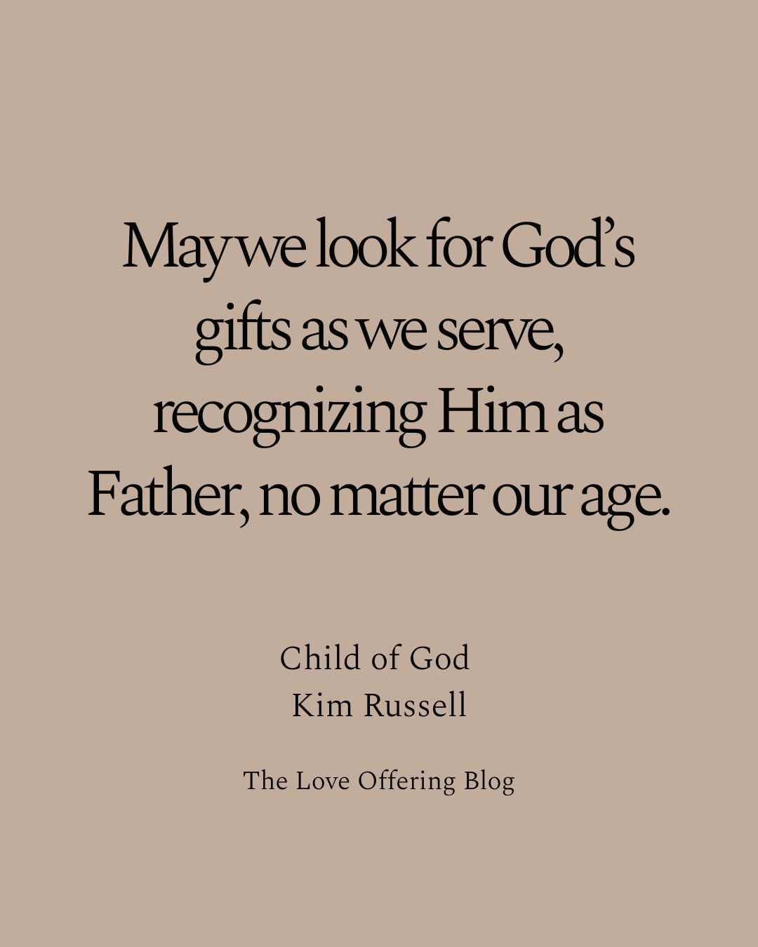 I am continuously thankful that not only does God show His love for me as His child, but He uses me to show His love to others. His using me is a gift, one I hope not to take for granted. May we look for God’s gifts as we serve, recognizing Him as Father, no matter our age.