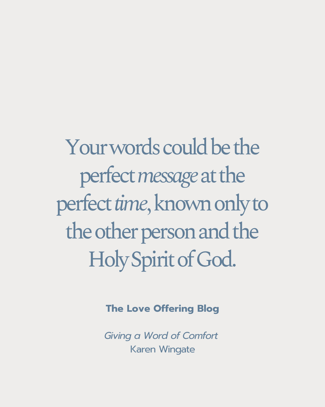 As Christ followers, we represent the God of all comfort. He’s the one in charge of helping the helpless and healing the wounded. He combines my words of concern with a loving gift from another and wise counsel from yet another, and then arranges it all into a love basket from himself. It’s his job to help the afflicted. He is the “Father of compassion” as 2 Corinthians 1:3 says, and you and I are part of a select team through whom God passes his love to the ones who struggle.