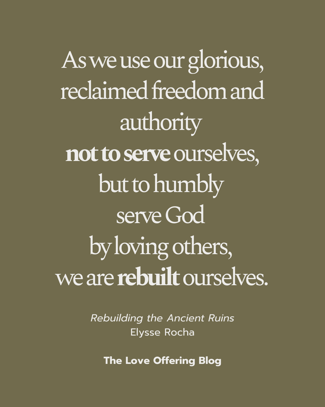 As we use our glorious, reclaimed freedom and authority not to serve ourselves, but to humbly serve God by loving others, we are rebuilt ourselves. One small (or great!) act of love and faithfulness at a time, we join God’s work of rebuilding and restoring what’s been ruined. This is the most meaningful work we can have. And even when we are yet feeble and far from producing fruit, this is the promise we have been given and are sure to receive as we trust Him and remain in His love.