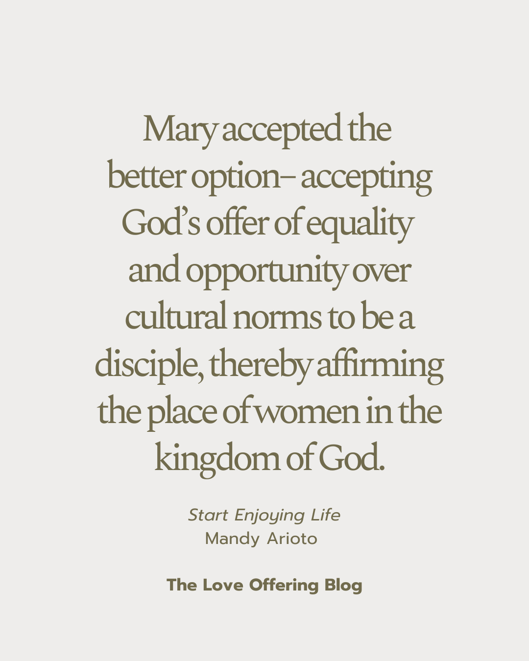 Martha’s response, begging Jesus to tell Mary to get up and help her, probably wasn’t about Martha being passive-aggressive or having too much work. She was likely worried that Mary would be publicly disgraced for such a bold indiscretion as sitting at a rabbi’s feet. Jesus tells Martha that Mary has chosen the better option– accepting God’s offer of equality and opportunity over cultural norms to be a disciple, thereby affirming the place of women in the kingdom of God.