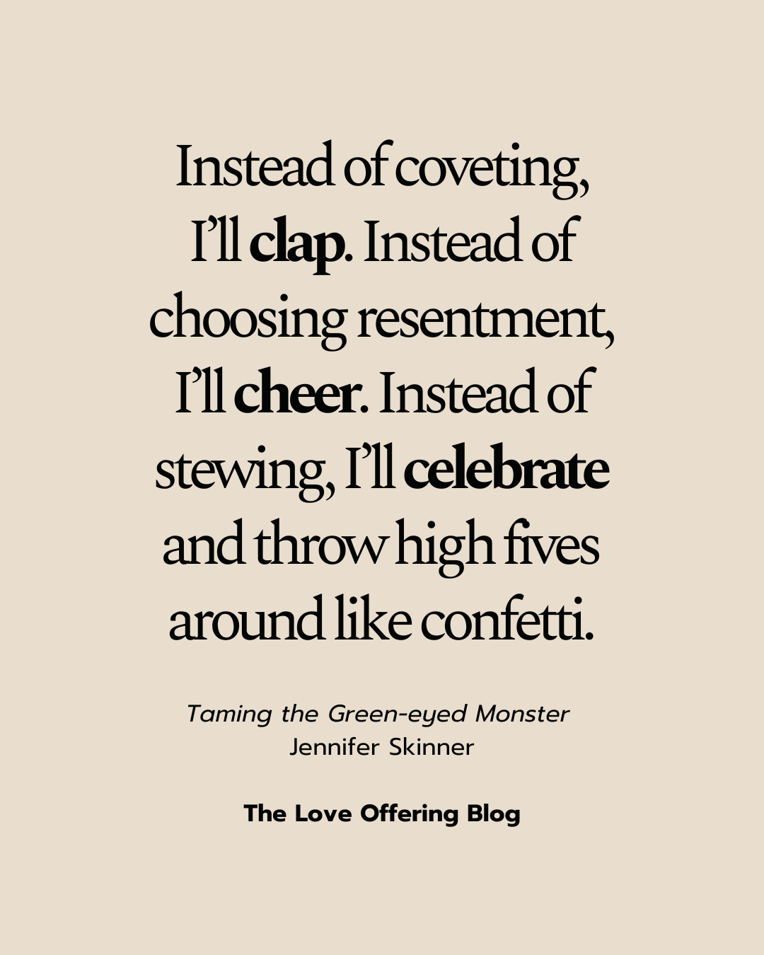 The next time I feel that green-eyed monster lurking, I’ll remember what a bunch of guys named Drew and Alex and Ryan taught me about an ancient commandment written by a guy named Moses. Instead of coveting, I’ll clap. Instead of choosing resentment, I’ll cheer. Instead of stewing, I’ll celebrate and throw high fives around like confetti. Before I know it that pit in my stomach might just disappear.