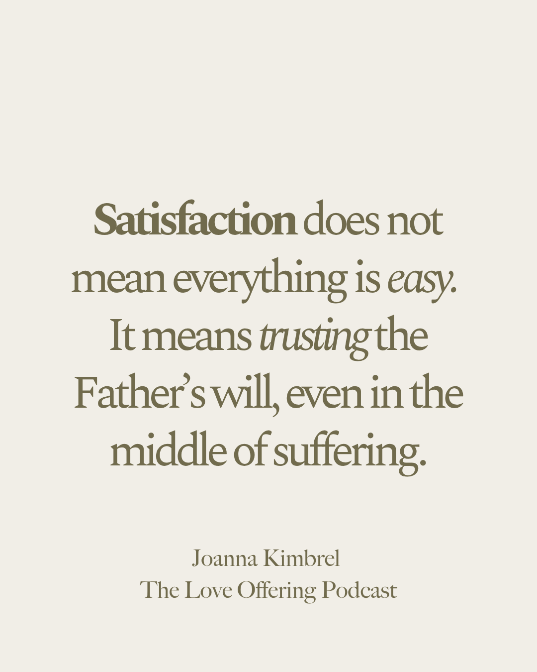 Hey, will you make us sit at your left and right hands in your kingdom? You know, they were striving for this place of position and this place of honor instead of being content with the fact that God has called them to follow him wherever he leads. Or, you know, I think about Abraham when God made him a promise: I will give you a son, and he will be the father of many nations, and Abraham and Sarah are getting really old. She is well into menopause, and there’s just no way naturally that’s going to happen. Abraham gets tired of waiting. He’s not content with God’s promise. And so Sarah says, why don’t you go sleep with Hagar, with this other woman, and bring a child for us. And so he does. And man, it causes all kinds of strife. But what I want to say, too, is that the beautiful thing about both examples is that they are cited in scripture as faithful followers of Jesus. I think that’s important for us because it’s really easy in this conversation to say, “Gosh, I have messed this up so much. Every single day, I think we struggle with this, and we make mistakes, but man, God is a God of grace and redemption. And so even if we have, we are, we continue to struggle with satisfaction, man, God can still redeem that and can still use us and still call us to himself. You know, as you were asking about what people, examples of people who lived satisfied. There are also many examples of people who did that but never consistently. You know, because later we do see that Abraham says that his faith didn’t waver, and he trusted that God could even raise his son from the dead when God asked him to sacrifice him. So he was satisfied with God’s promise in that moment. You know, we see all of these times when people mess up with both. I think the only true example we can look to is Christ. He’s the only one who has ever lived a satisfied life. And you know, it’s so interesting because looking at Christ as the example of being satisfied probably feels counterintuitive because I think our definition of satisfaction in our minds might mean comfortable. It might mean easy. It might mean having all the things we want if things were going the way we hoped they would. Christ was called a man of suffering, acquainted with grief. And his satisfaction was found in trusting the Father’s will. He even prayed in the garden, God, this is the night before he was arrested, he prayed, God, if there is any way for this to not happen, if there’s any way that I cannot go to the cross, please let it be so, but not my will, but your will be done. Jesus experienced a depth of agony we can never imagine, but he was also the most completely satisfied human to ever walk the earth because he entrusted himself fully to the will of the Father. He had a complete, uninterrupted, intimate relationship with God. He trusted his plans. He trusted his promises. He was satisfied in all circumstances. He trusted God’s word for his life. So satisfaction does not have to be that everything is good and happy all the time. know, Paul says that we are sorrowful yet always rejoicing. And I think that that really is such a beautiful description of what being satisfied in God really is.